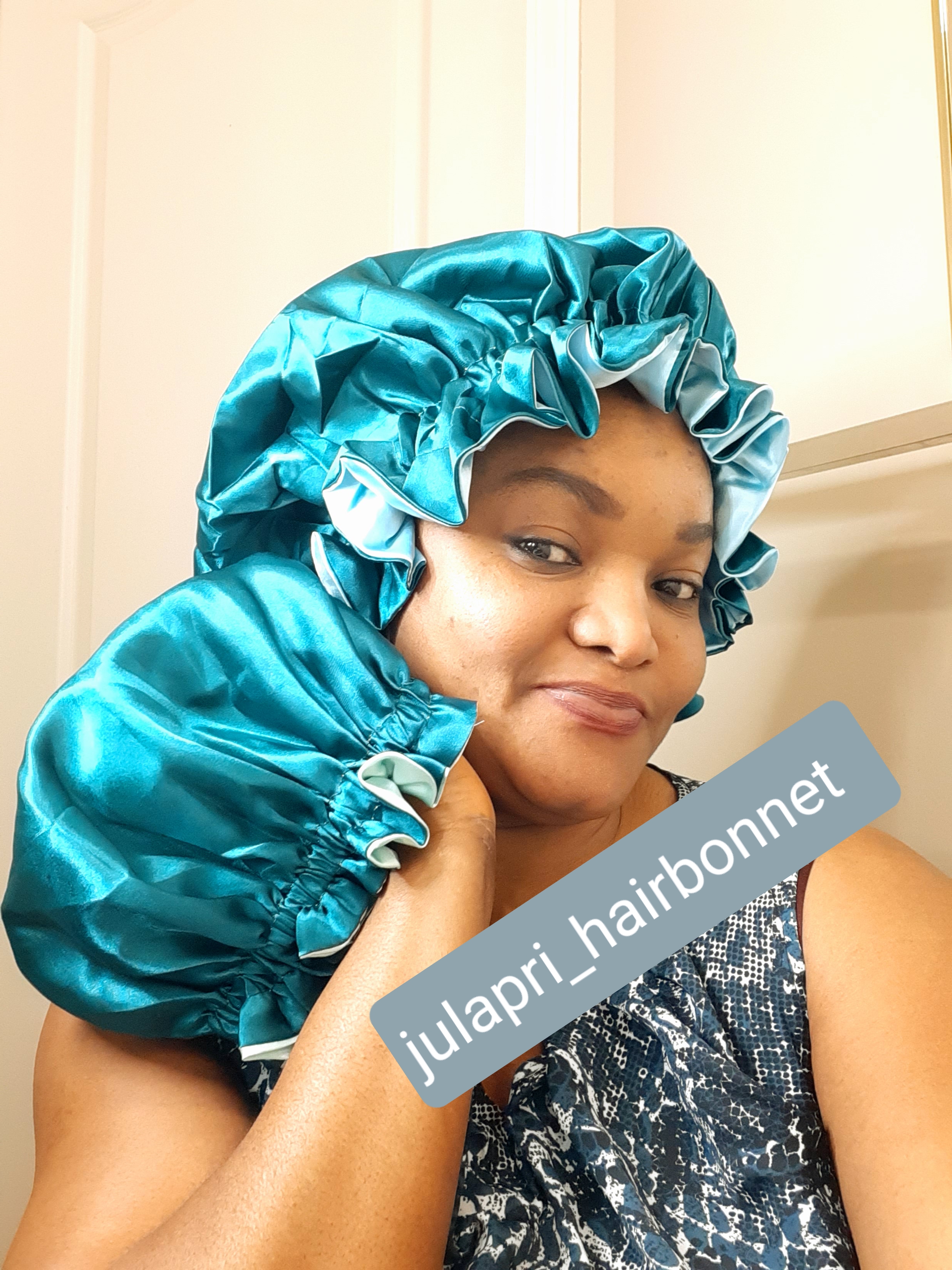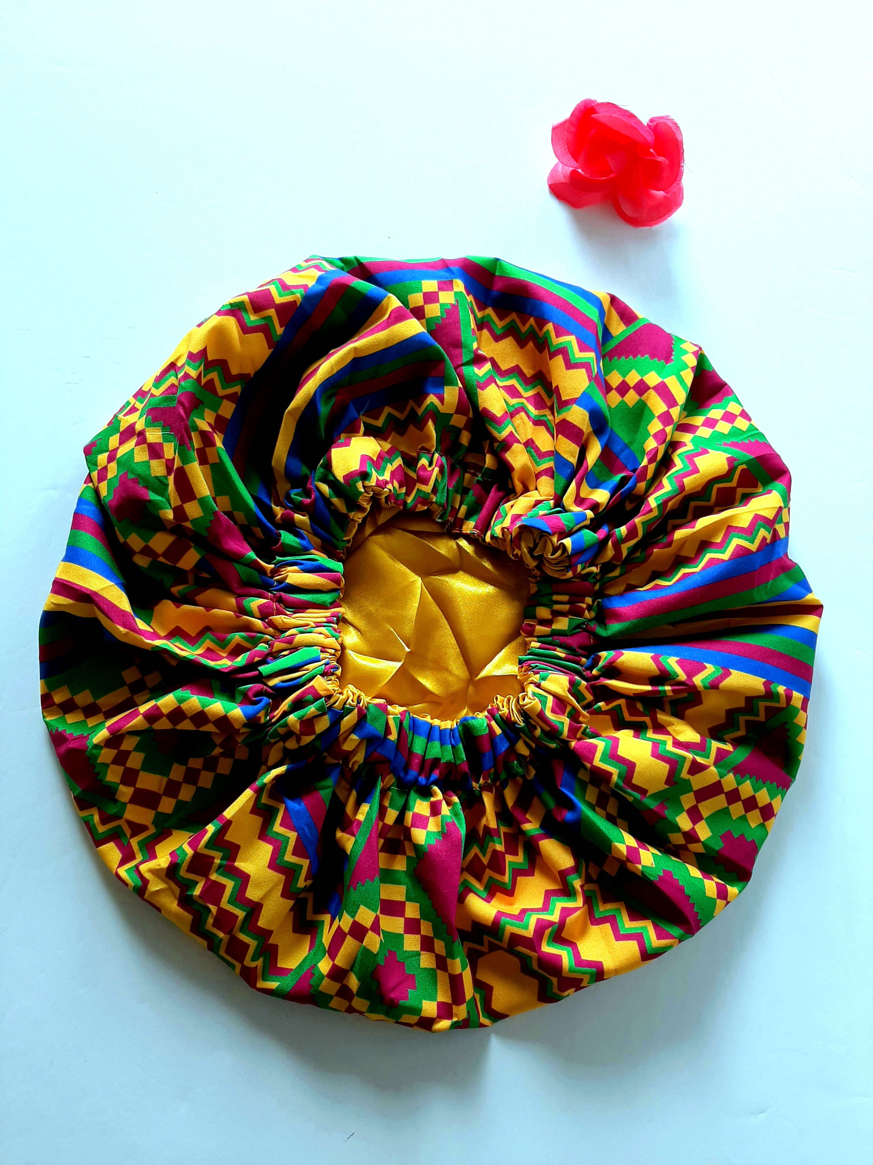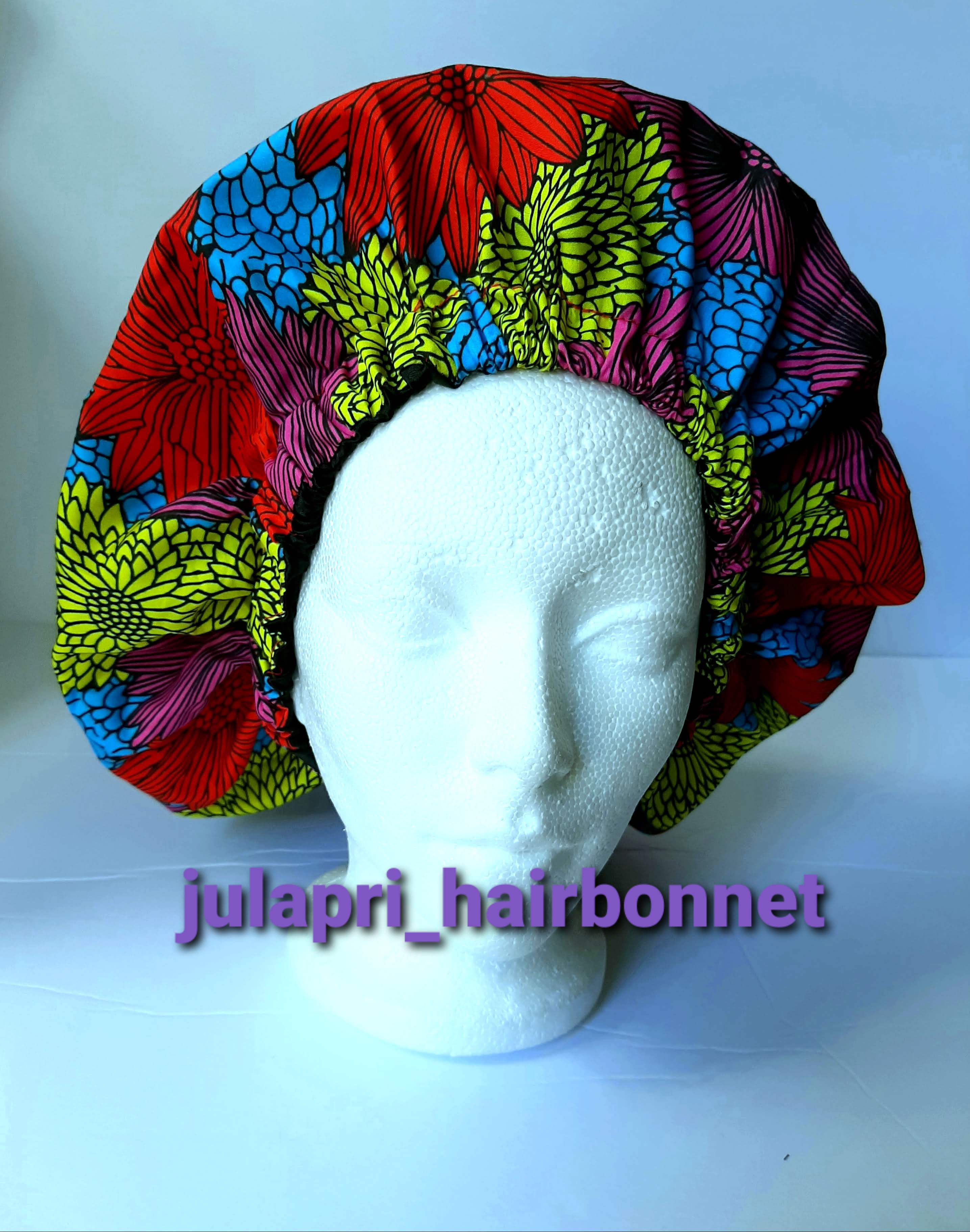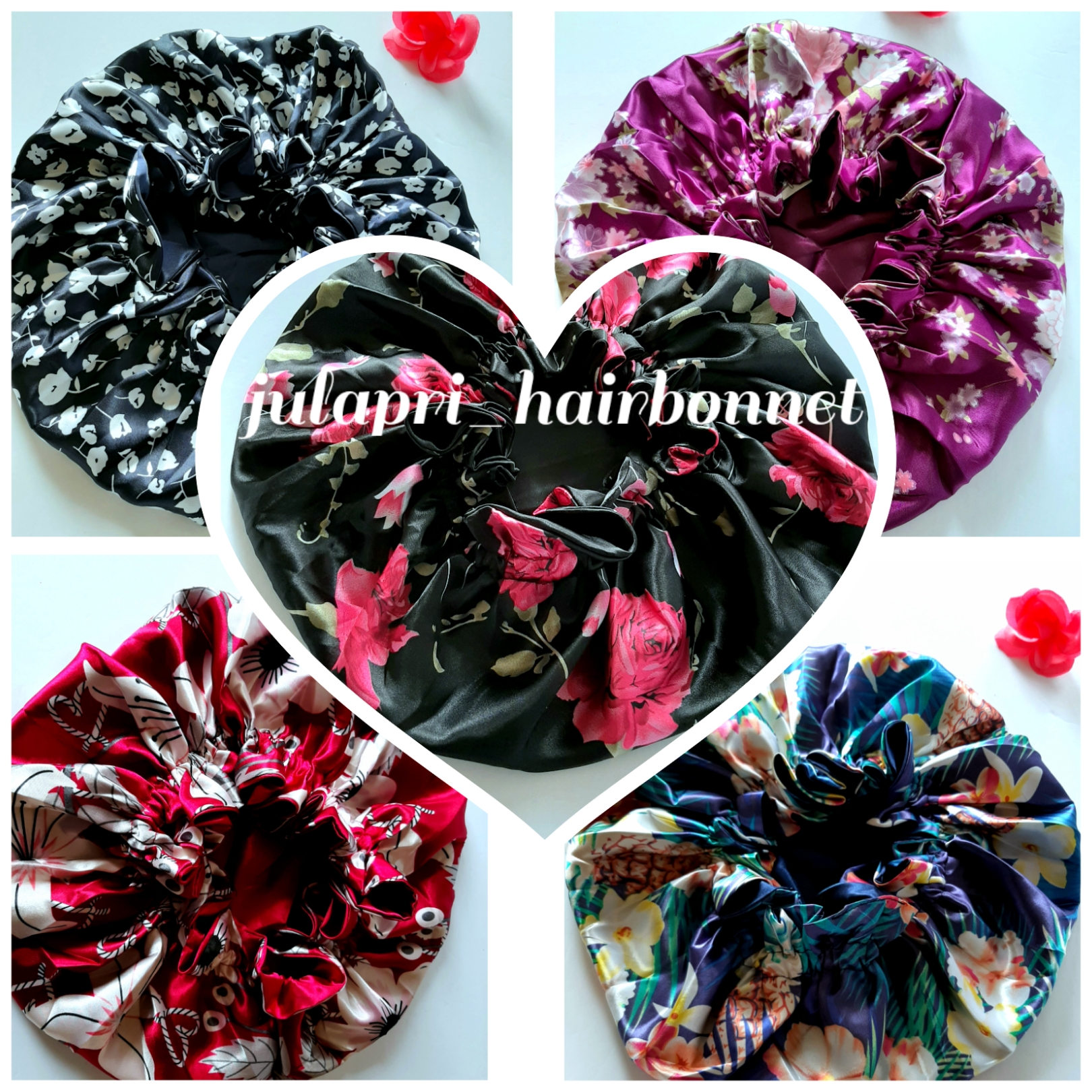 Handmade Hair bonnets made with Silk fabrics, Helps to protect your hair from breakages by keeping it moisturized.  We also have shower caps, for adult and children hair scrunchies and headwraps